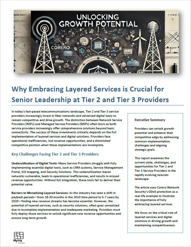 Providers can unlock growth potential and enhance their competitive edge by addressing common implementation challenges and aligning strategic goals. This report examines the current state, challenges, and opportunities for Tier 2 and Tier 3 service providers in the rapidly evolving telecommunications landscape. The article uses Corero Network Security's DDoS protection as a real-life example to illustrate the importance of fully embracing layered services. We focus on the critical role of layered services and digital solutions in driving growth and maintaining competitiveness. Embracing layered services is not just a strategy; it’s a necessity for Tier 2 and Tier 3 providers looking to unlock their growth potential. Imagine a world where your offerings are not just products but comprehensive solutions that cater to diverse client needs. Integrating layered services creates a value proposition that sets you apart in a crowded market.